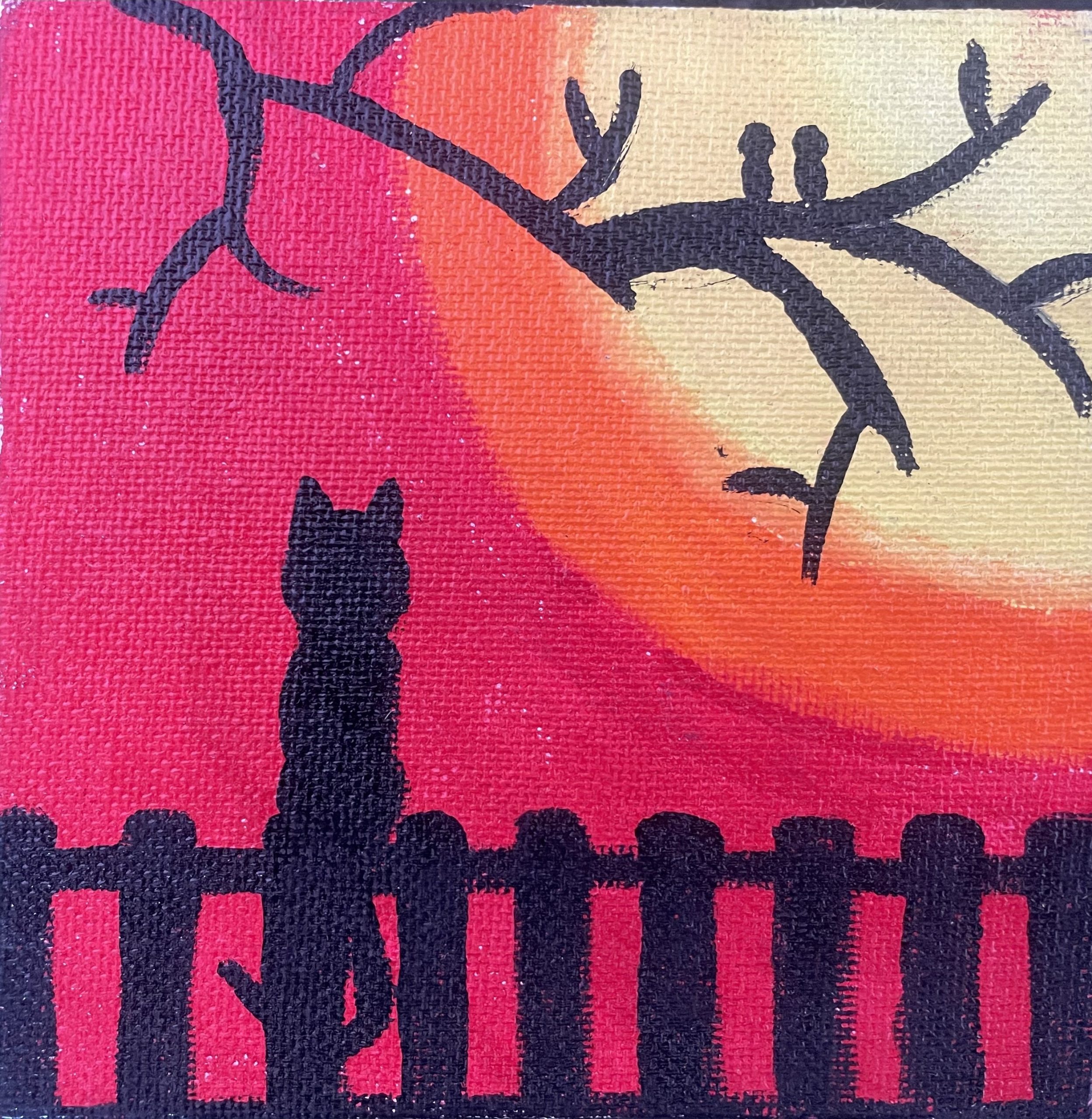 Bring home the quiet beauty of dusk with this evocative canvas drawing. The artwork features a tranquil evening view: a lone cat sitting peacefully near a tree, while two birds rest gently on its branches. As the sun sets in the background, only their delicate shadows remain, creating a silhouette that blends simplicity with emotional depth. This piece is perfect for lovers of nature, pets, and minimalistic art — a gentle reminder of calm moments in a fast-paced world.